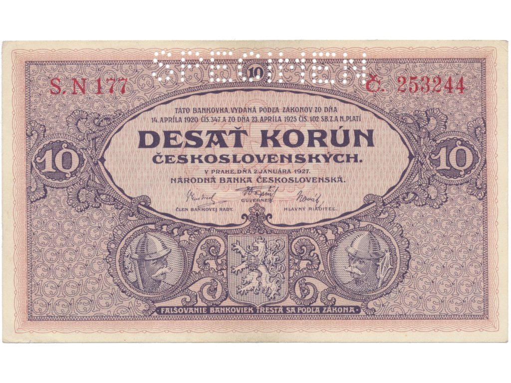 10 Koruna 1927, série N, SPECIMEN, Hej.22b.S1