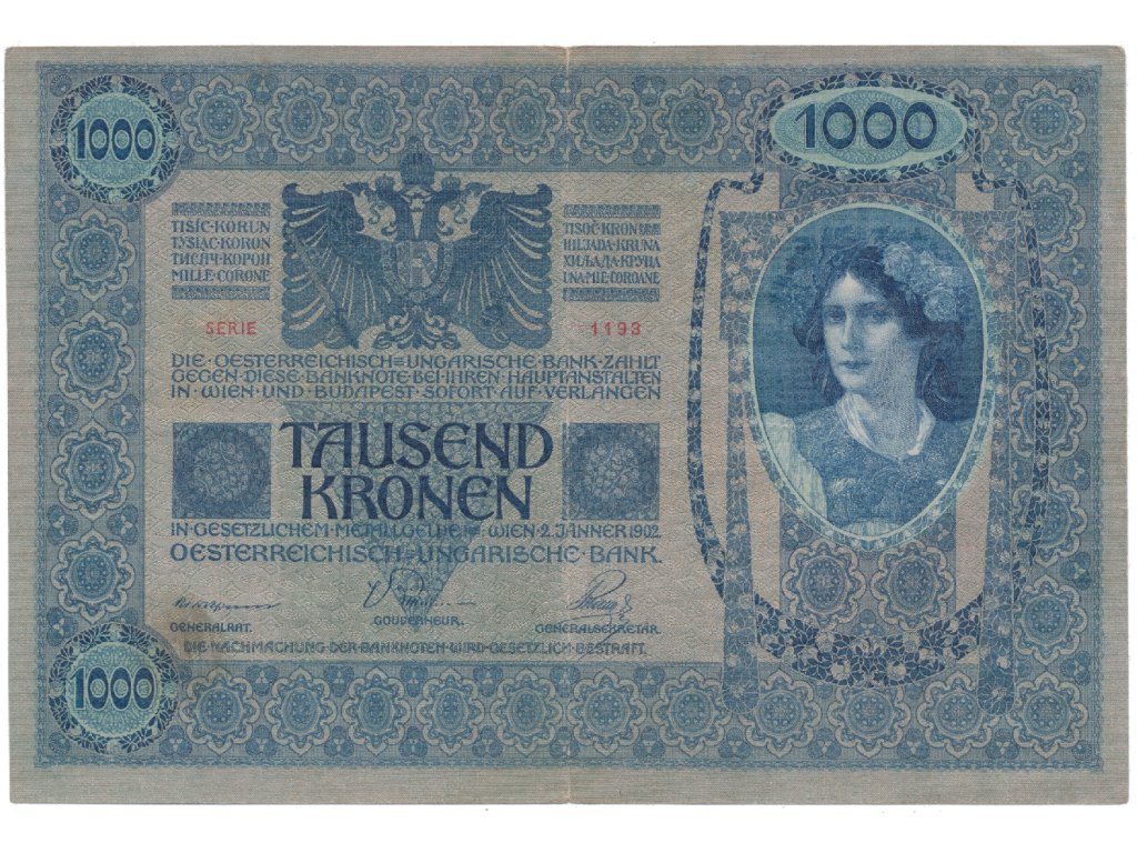 1000 Koruna 1902 (1919), šedozelený podtisk, kolkovaná, Hej.6a
