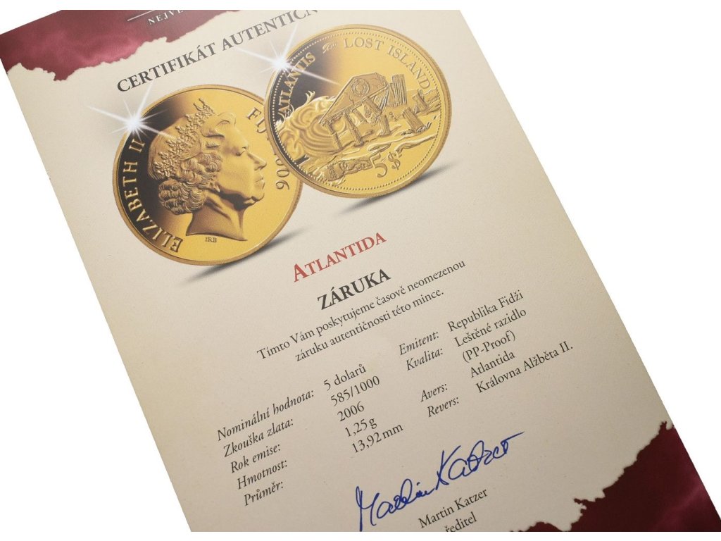 5 Dolarů 2006 - Atlantida - Au 585/1000 - 1,25 g - 13,92 mm - Kapsle - PROOF + Certifikát