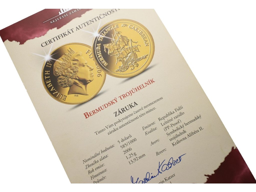 5 Dolarů 2006 - Bermudský trojúhelník- Au 585/1000 - 1,25 g - 13,92 mm - Kapsle - PROOF + Certifikát