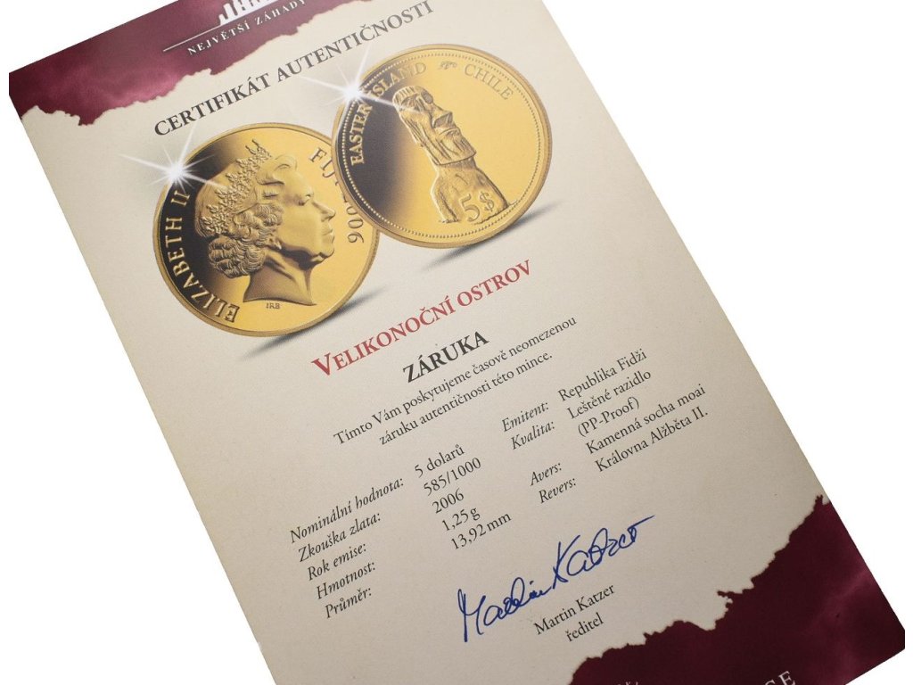 5 Dolarů 2006 - Velikonoční ostrov - Au 585/1000 - 1,25 g - 13,92 mm - Kapsle - PROOF + Certifikát