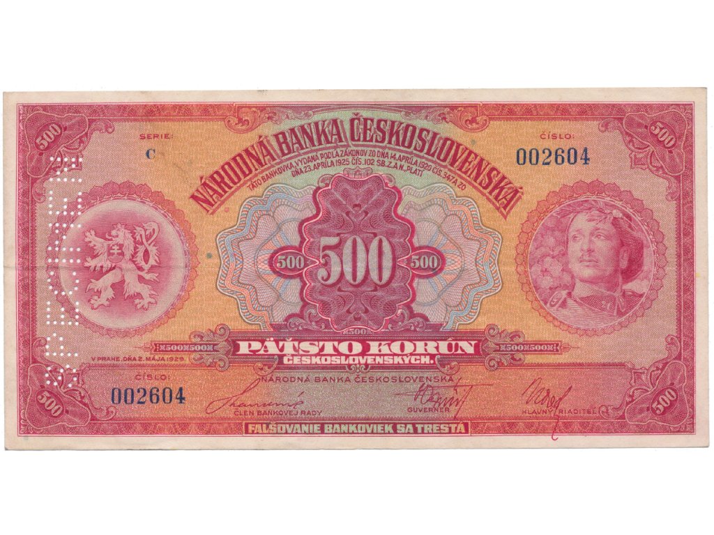 500 Koruna 1929, série C, SPECIMEN svisle, Hej.23c.S2