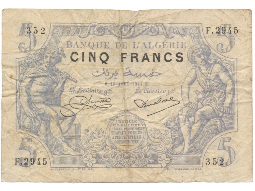 Alžírsko, 5 Francs 1924, P.71b