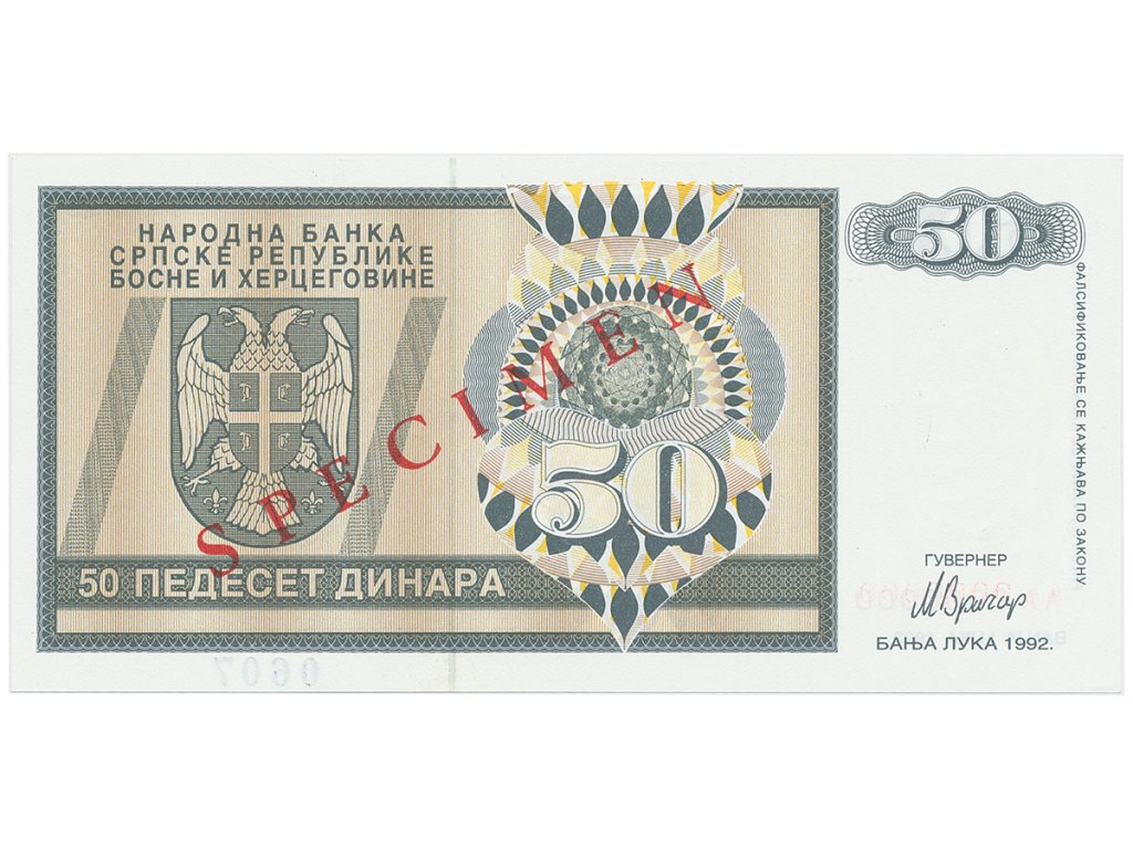 Bosna a Hercegovina, 50 Dinara 1992, bankovní vzor, AA 0000000, přet. SPECIMEN, P.134s