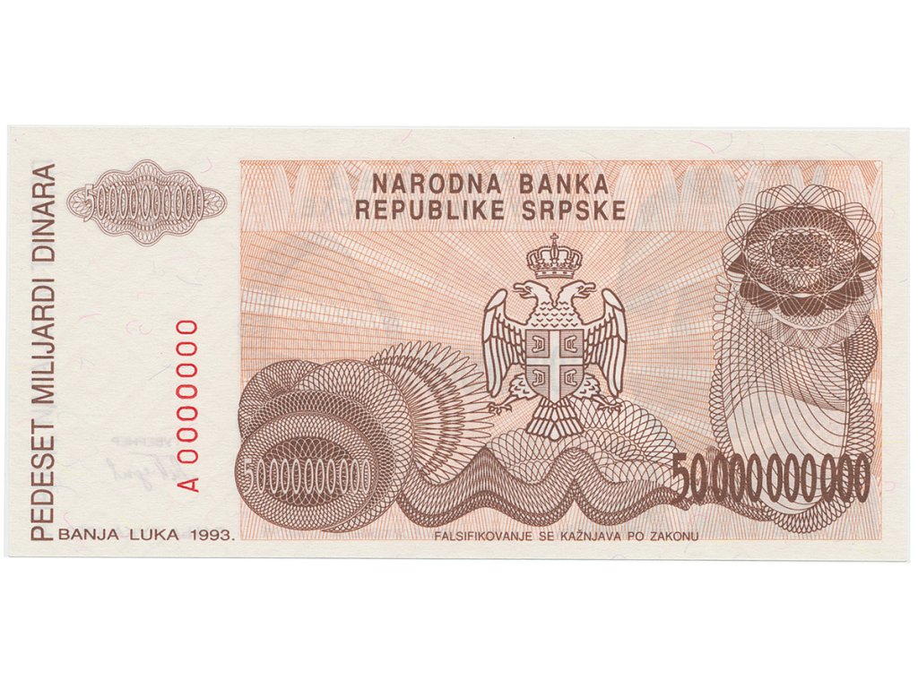 Bosna a Hercegovina, 50 Milijardi Dinara 1993, nevydaná, anulát, A 0000000, P.157