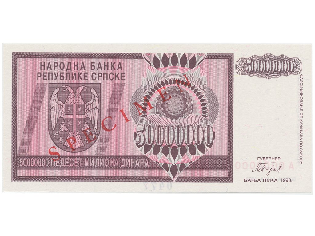 Bosna a Hercegovina, 50 Miliona Dinara 1993, bankovní vzor, A 0000000, přet. SPECIMEN, P.145s