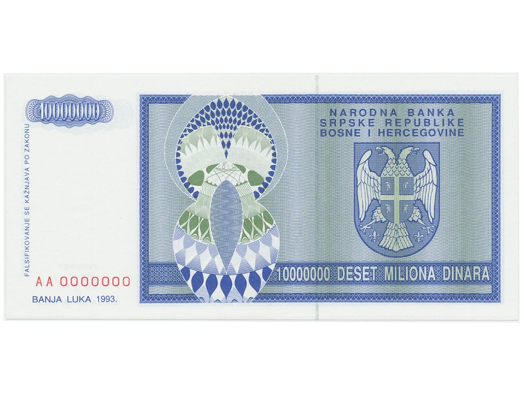Bosna a Hercegovina, 10 Miliona Dinara 1993, anulát, AA 0000000, P.144