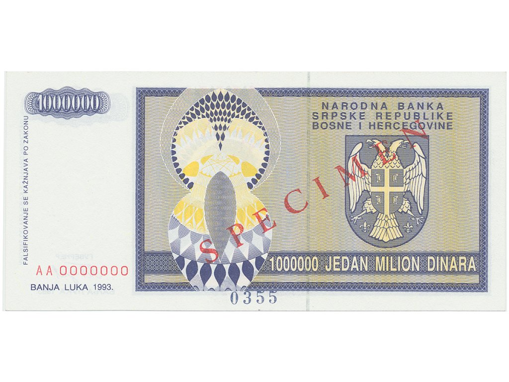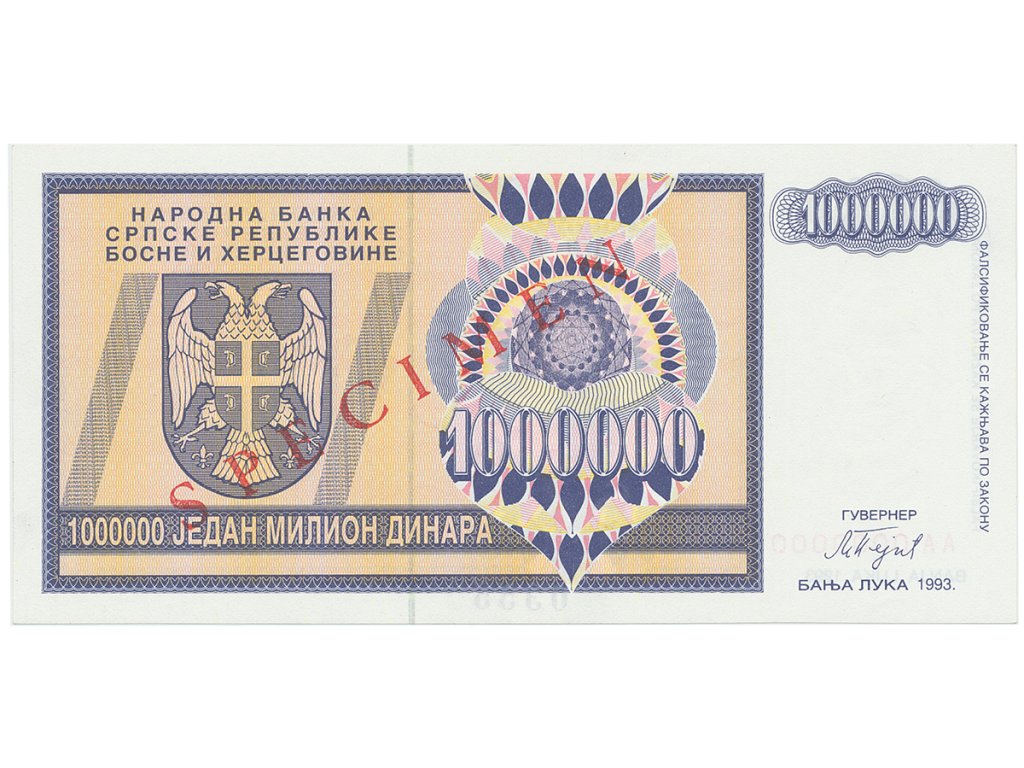 Bosna a Hercegovina, 1 Milion Dinara 1993, bankovní vzor, AA 0000000, přet. SPECIMEN, P.142s