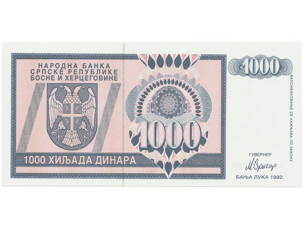Bosna a Hercegovina, 1000 Dinara 1992, anulát, AA 0000000, P.137