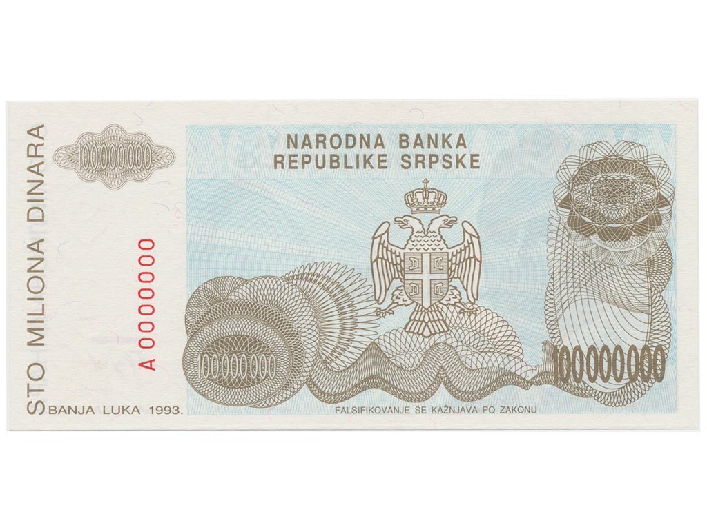 Bosna a Hercegovina, 100 Miliona Dinara 1993, anulát, A 0000000, P.154