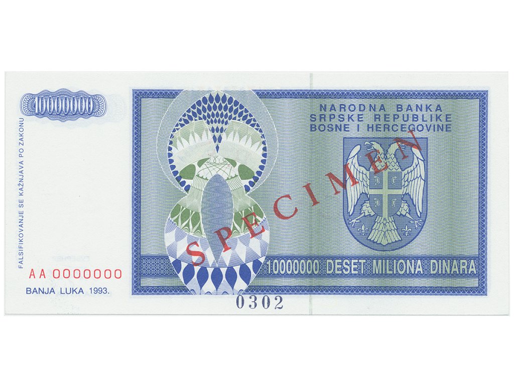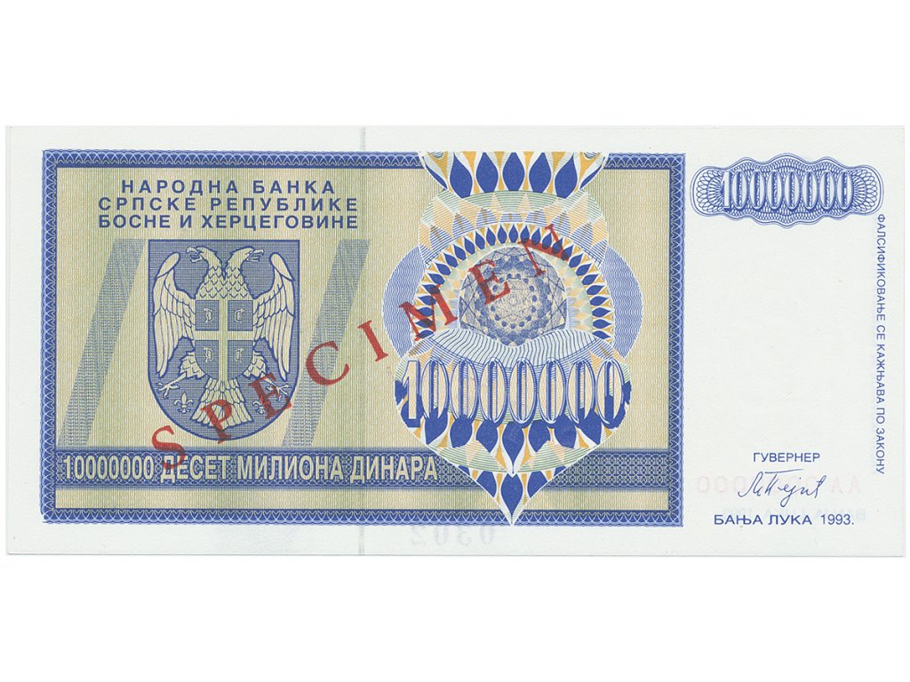 Bosna a Hercegovina, 10 Miliona Dinara 1993, bankovní vzor, AA 0000000, přet. SPECIMEN, P.144s