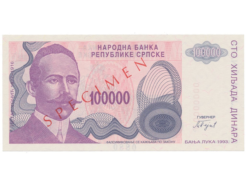 Bosna a Hercegovina, 100.000 Dinara 1993, bankovní vzor, A 0000000, přet. SPECIMEN, P.151s