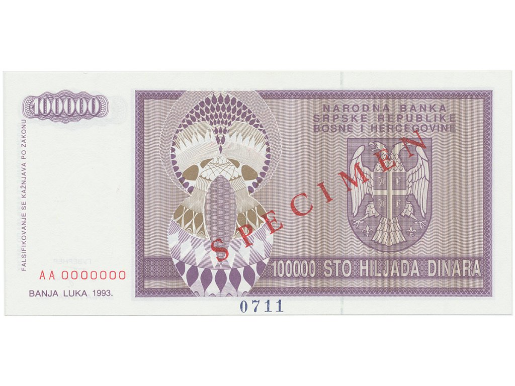 Bosna a Hercegovina, 100.000 Dinara 1993, bankovní vzor, AA 0000000, přet. SPECIMEN, P.141s