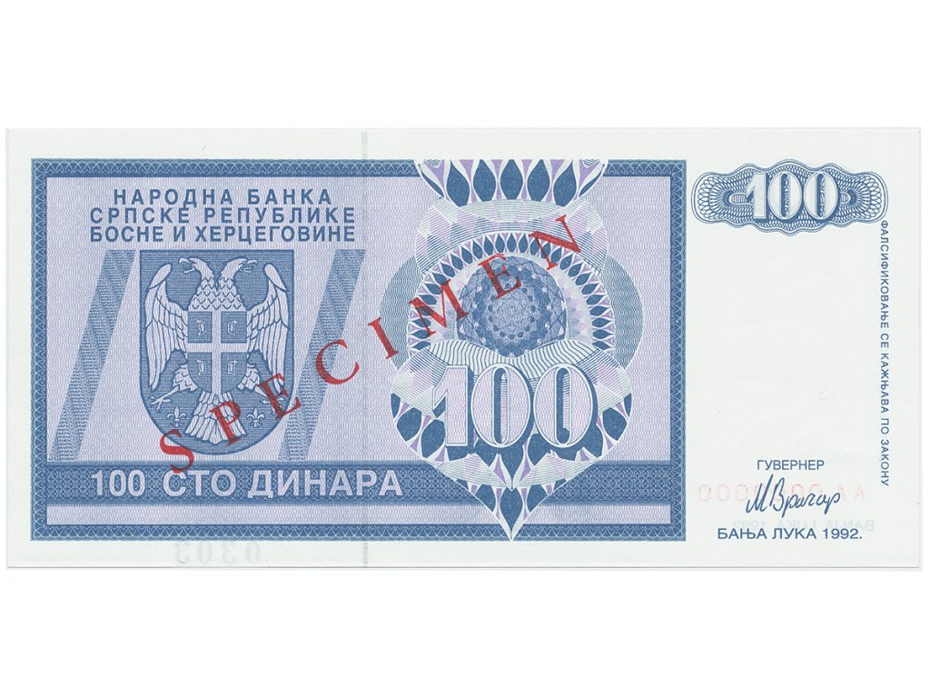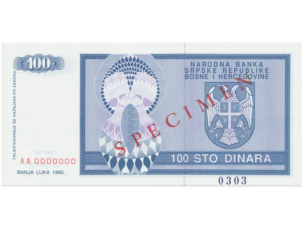 Bosna a Hercegovina, 100 Dinara 1992, bankovní vzor, AA 0000000, přet. SPECIMEN, P.135s