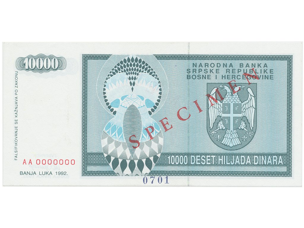 Bosna a Hercegovina, 10.000 Dinara 1992, bankovní vzor, AA 0000000, přet. SPECIMEN, P.139s