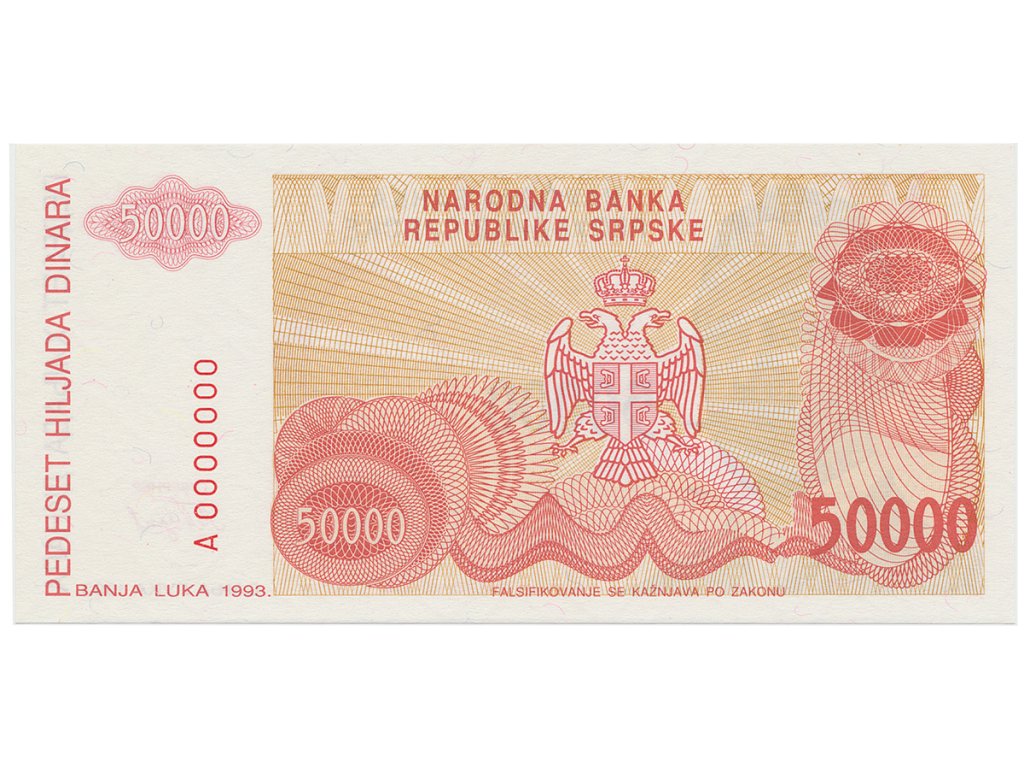 Bosna a Hercegovina, 50.000 Dinara 1993, anulát, A 0000000, P.150