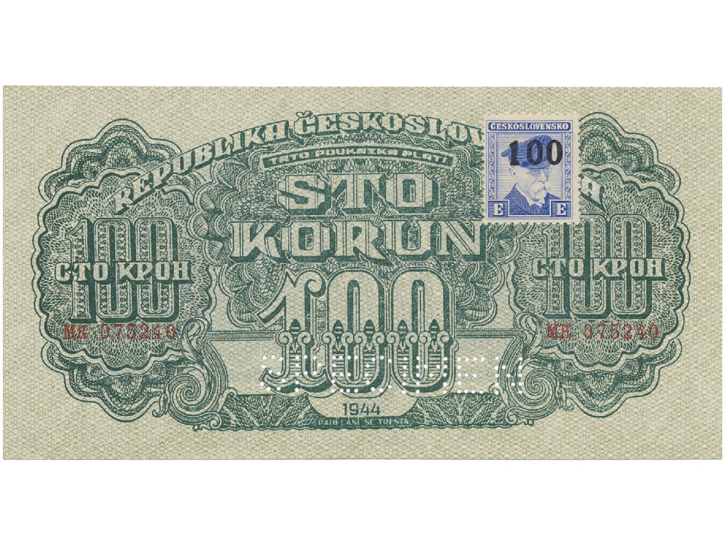 Československo, 100 Koruna 1944/1945, kolkovaná, číslovač 19 mm, perf. 1x SPECIMEN dole, Hej.66a.S2