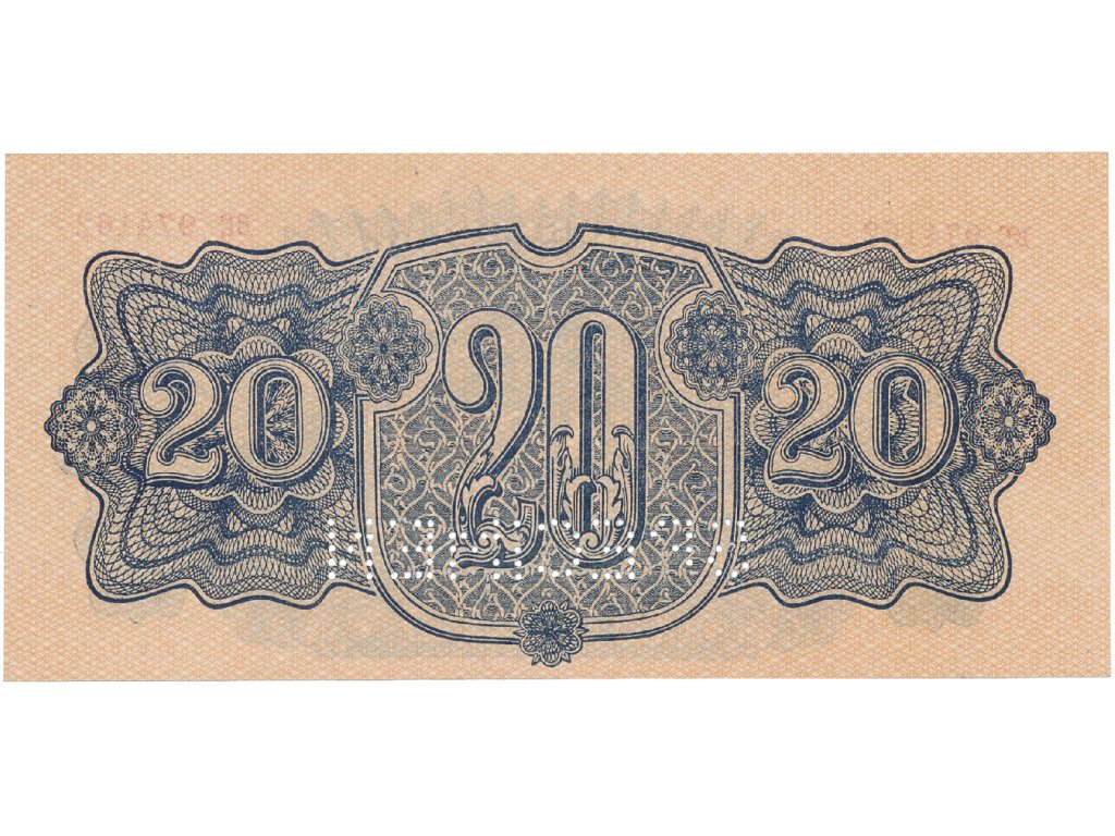 Československo, 20 Koruna 1944, číslovač 19 mm, perf. 1x SPECIMEN dole, Hej.58a.S2
