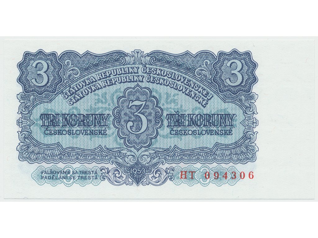 Československo, 3 Koruna 1953, tisk Praha, série HT, Hej.90b