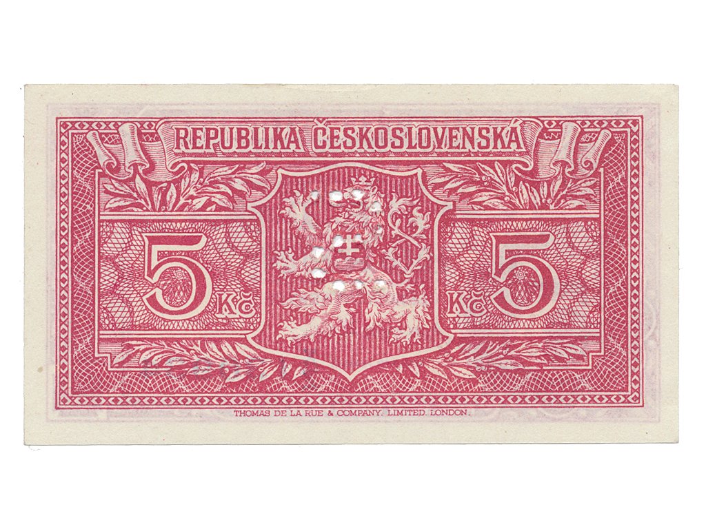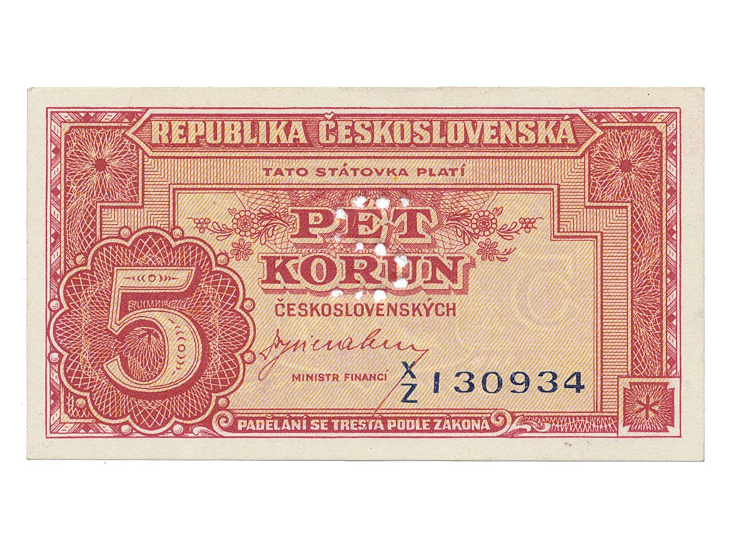 Československo, 5 Koruna b.d. (1945), perforace písmenem "S", Hej.70a.S3