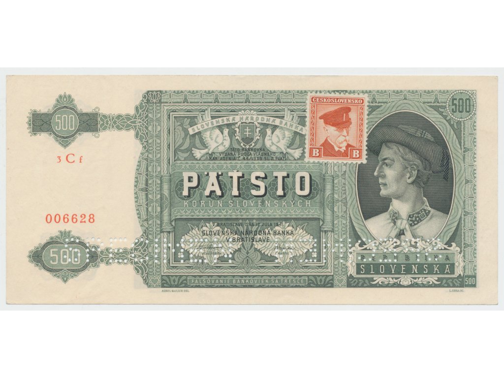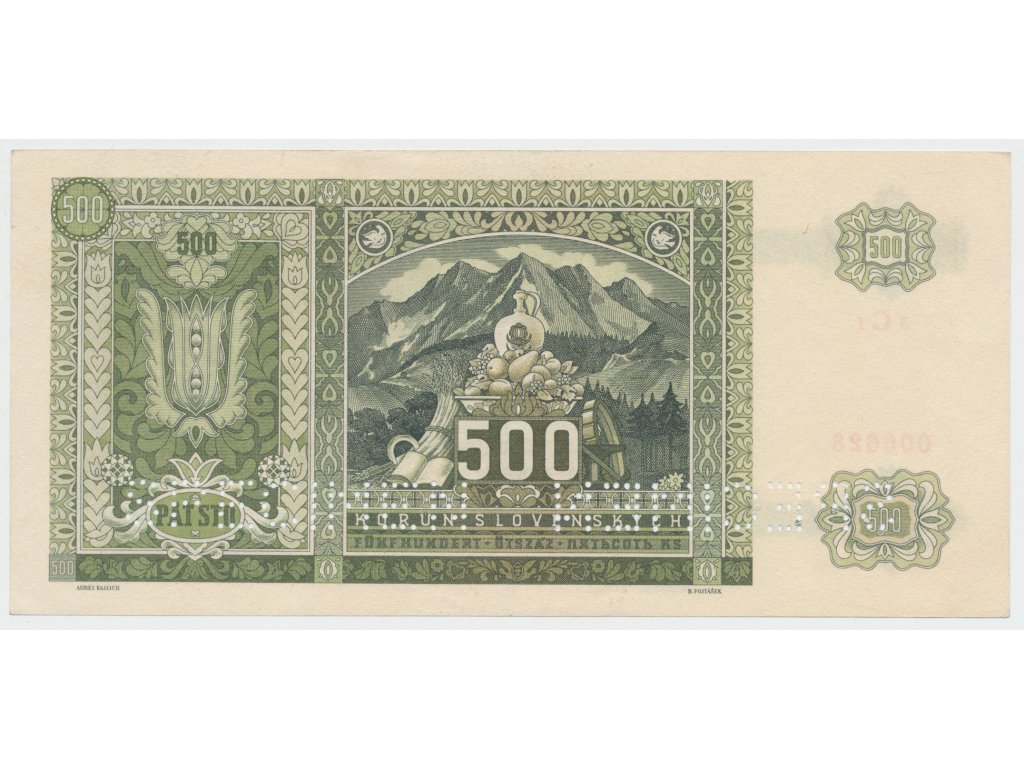 Československo, 500 Koruna 1941/1945, kolkovaná, perf. 2x SPECIMEN dole, Hej.64a.S3