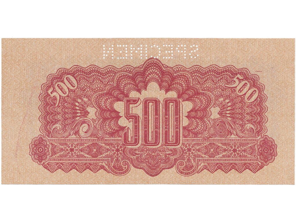 Československo, 500 Koruna 1944/1945, kolkovaná, perf. 1x SPECIMEN nahoře, Hej.67a.S1