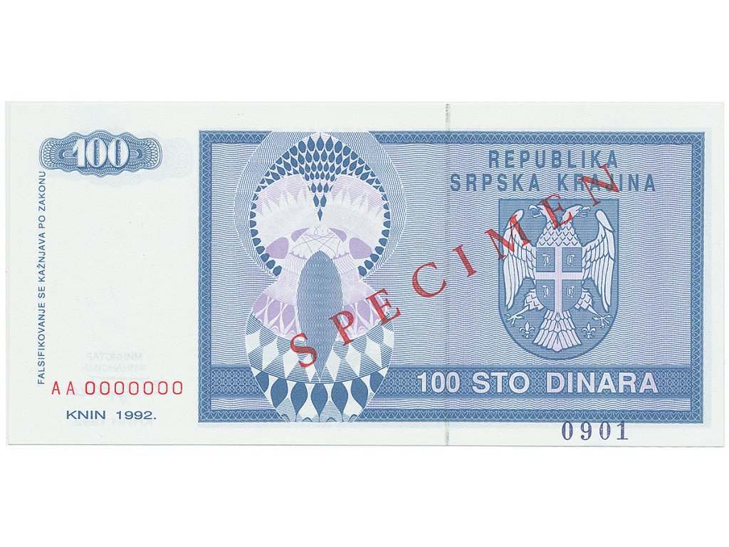 Chorvatsko - Srbská Krajina, 100 Dinara 1992, bankovní vzor, AA 0000000, přet. SPECIMEN, P.R3s