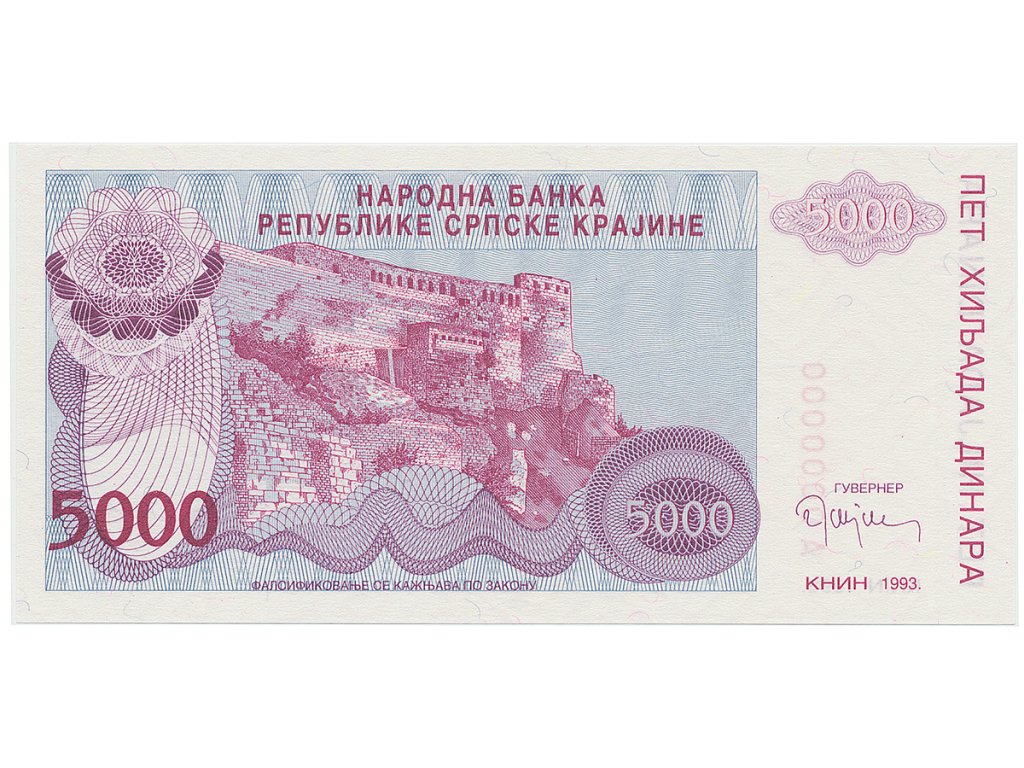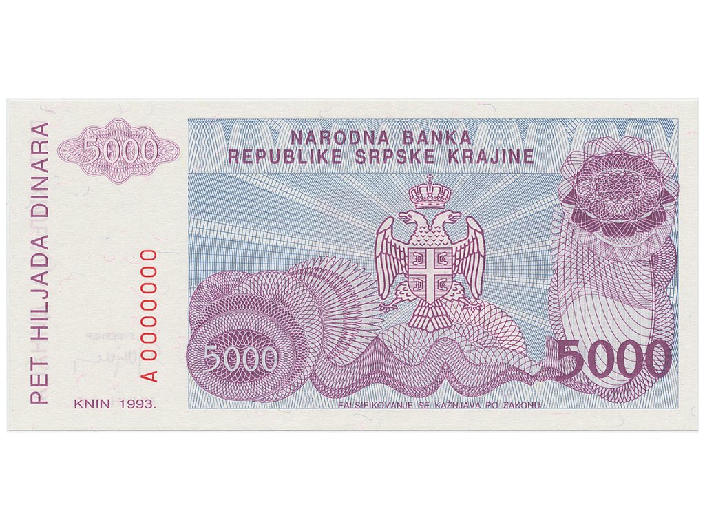 Chorvatsko - Srbská Krajina, 5000 Dinara 1993, anulát, A 0000000, P.R20