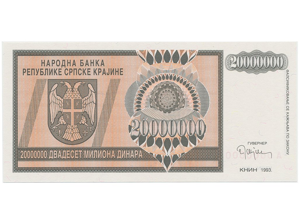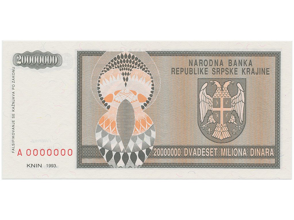 Chorvatsko - Srbská Krajina, 20.000.000 Dinara 1993, anulát, A 0000000, P.R13