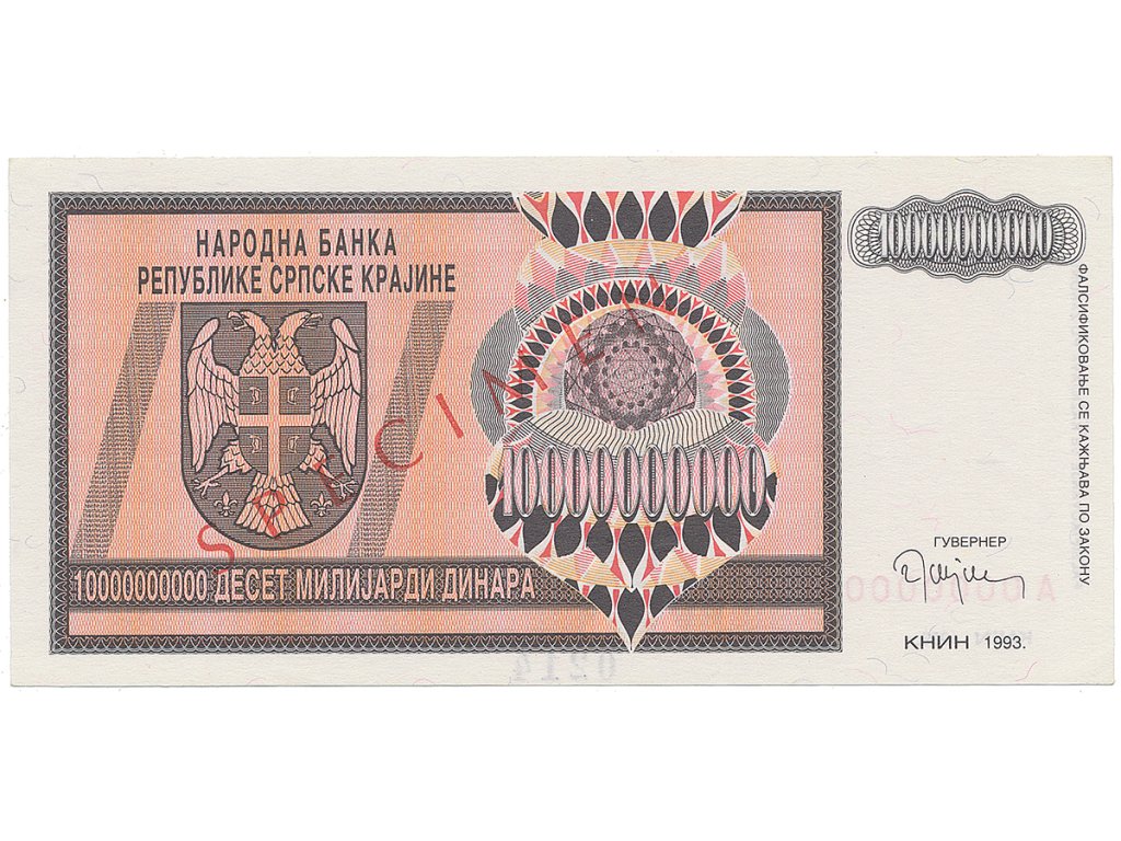 Chorvatsko - Srbská Krajina, 10 Milijardi Dinara 1993, bankovní vzor, A 0000000, přet. SPECIMEN, P.R19s