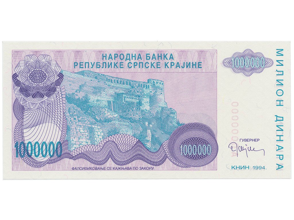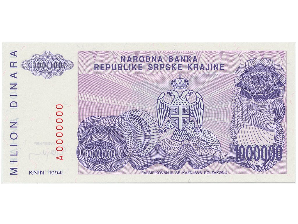 Chorvatsko - Srbská Krajina, 1 Milion Dinara 1994, anulát, A 0000000, P.R33