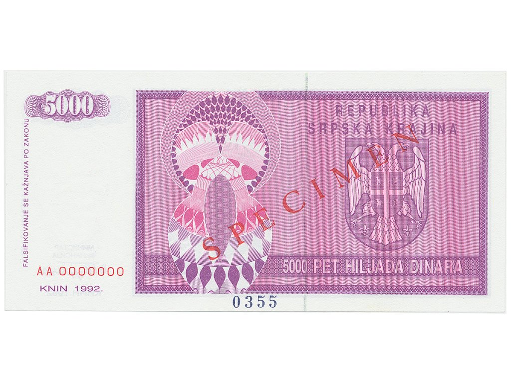 Chorvatsko - Srbská Krajina, 5000 Dinara 1992, bankovní vzor, AA 0000000, přet. SPECIMEN, P.R6s