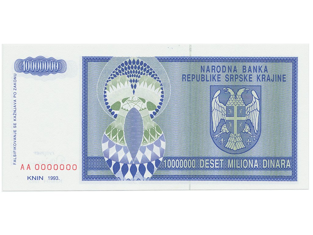 Chorvatsko - Srbská Krajina, 10.000.000 Dinara 1993, anulát, AA 0000000, P.R12