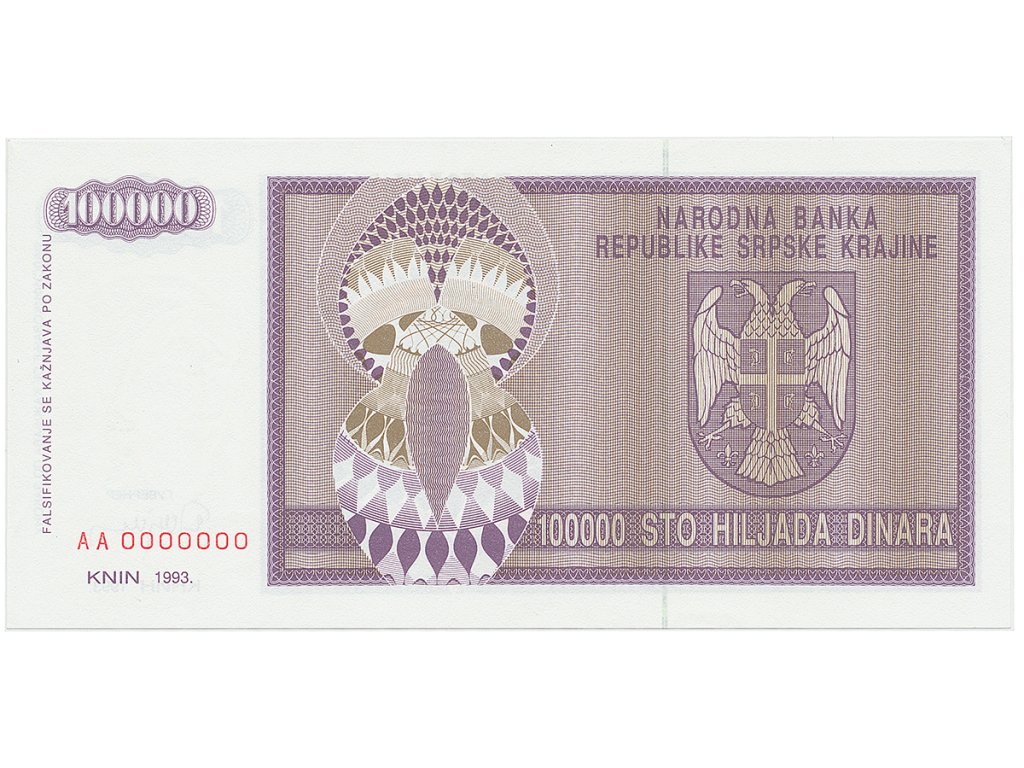 Chorvatsko - Srbská Krajina, 100.000 Dinara 1993, anulát, AA 0000000, P.R9