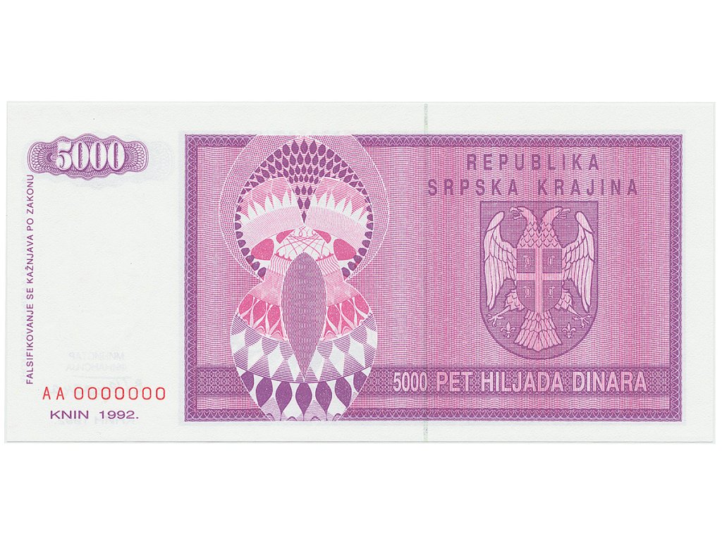 Chorvatsko - Srbská Krajina, 5000 Dinara 1992, anulát, AA 0000000, P.R6