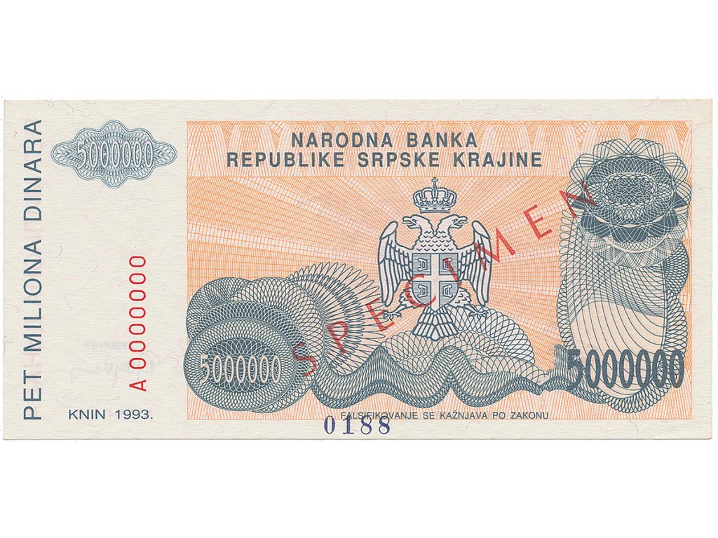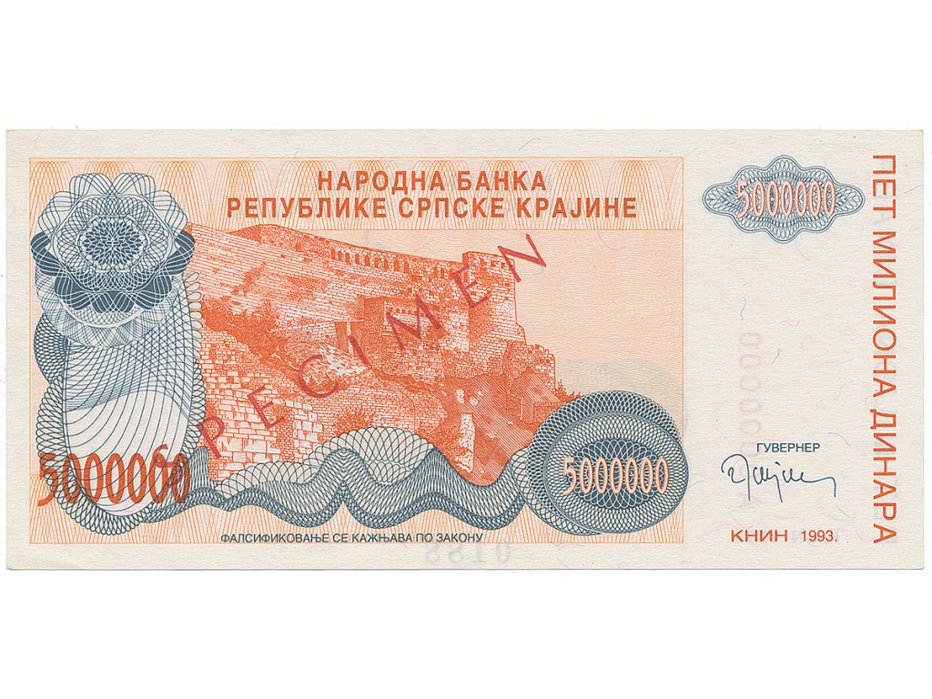 Chorvatsko - Srbská Krajina, 5 Miliona Dinara 1993, bankovní vzor, A 0000000, přet. SPECIMEN, P.R24s