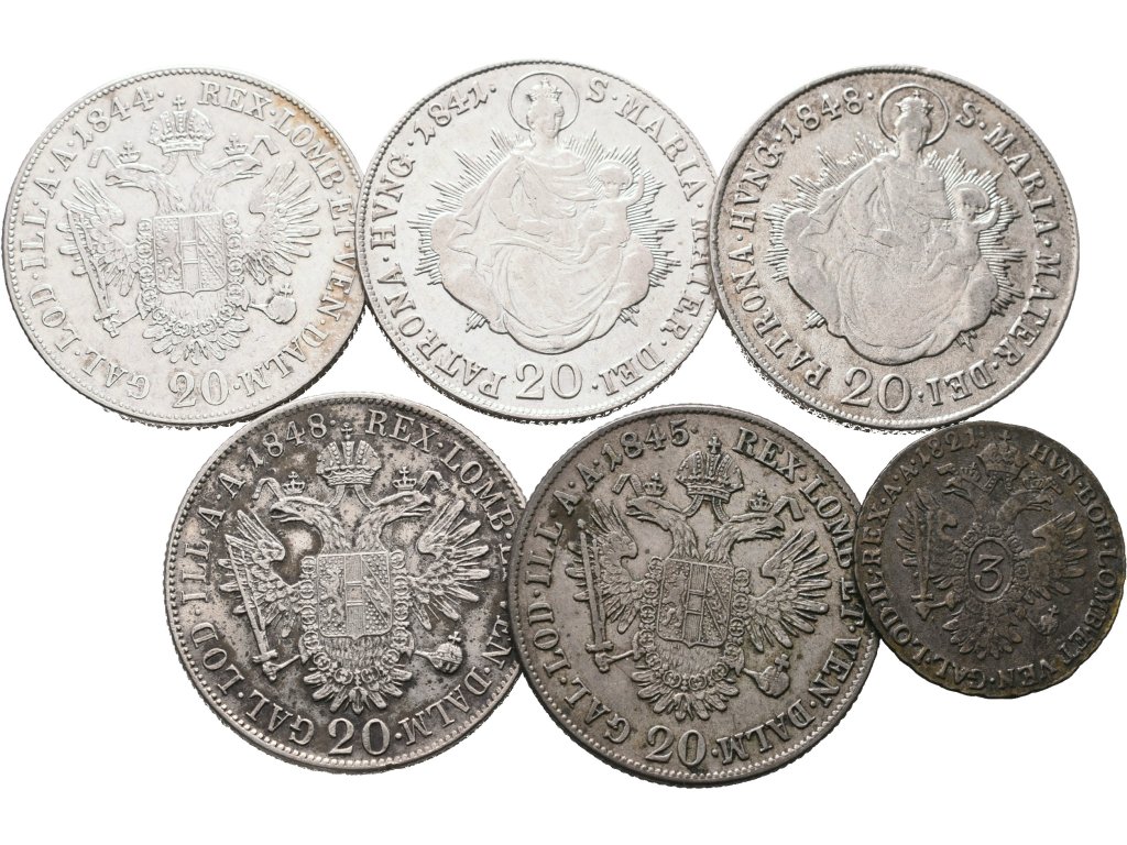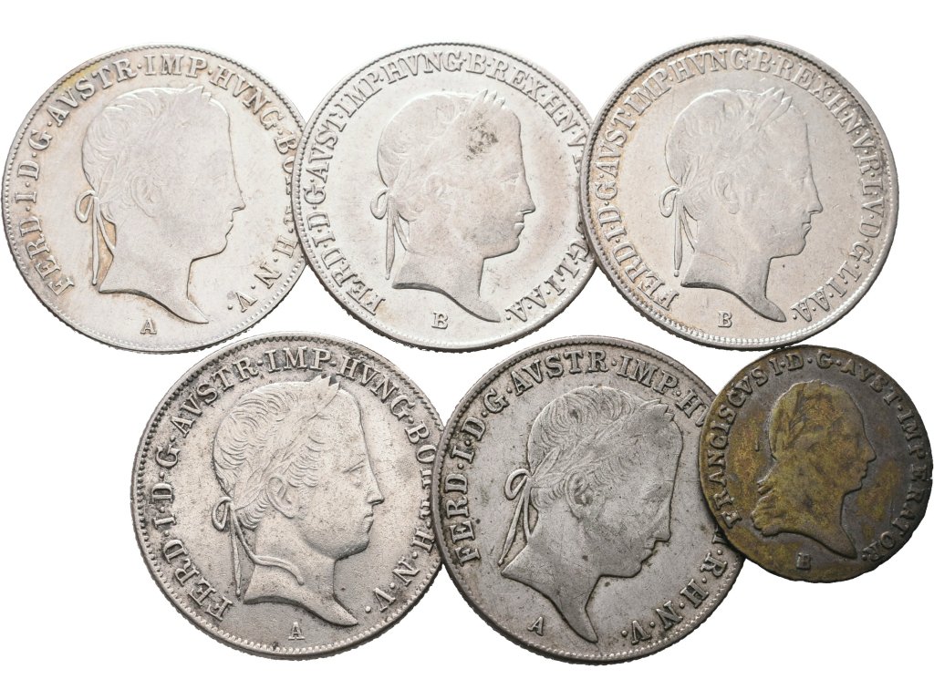 Ferdinand V., 20 Krejcar 1841, 1844, 1845, 2x 1848 a 3 Krejcar 1821, lot 6 ks