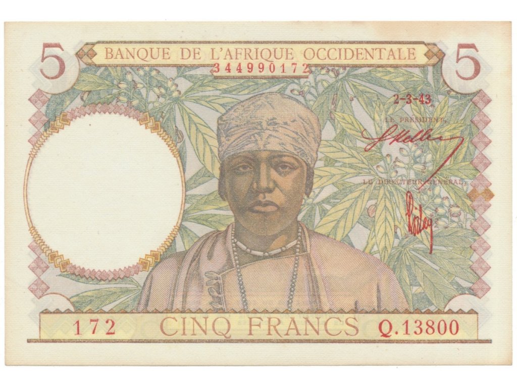 Francouzská Západní Afrika, 5 Francs 1943, červené podpisy, P.26