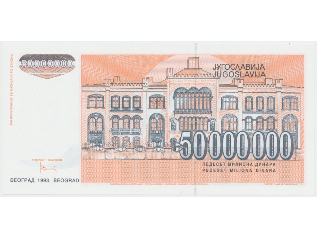 Jugoslávie, 50.000.000 Dinara 1993, anulát AA 0000000, P.123