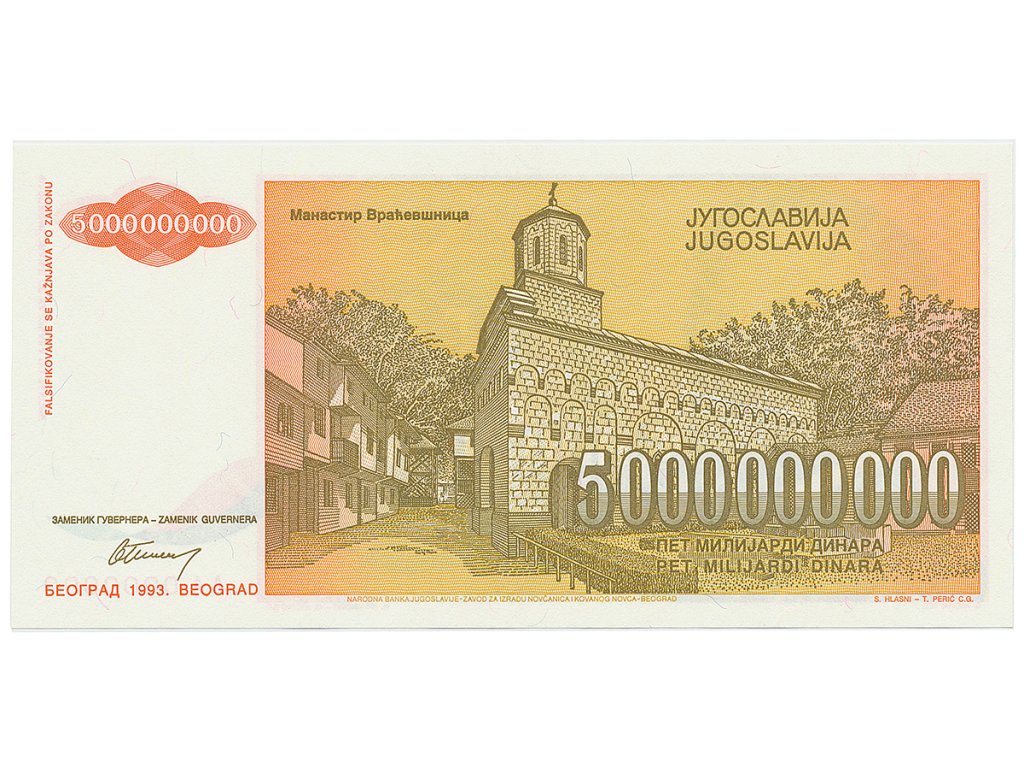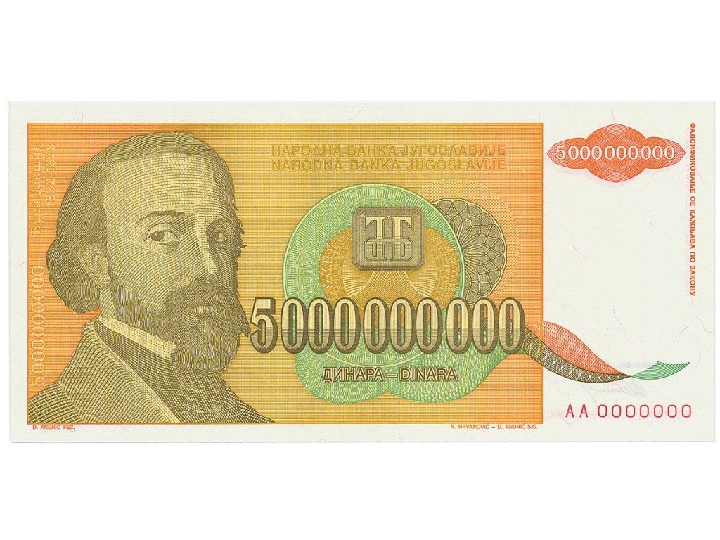 Jugoslávie, 5.000.000.000 Dinara 1993, anulát AA 0000000, P.135