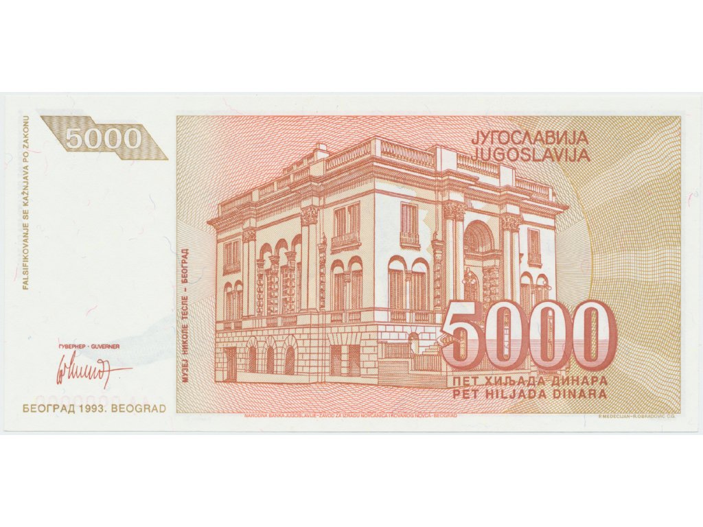 Jugoslávie, 5000 Dinara 1993, anulát AA 0000000, P.128