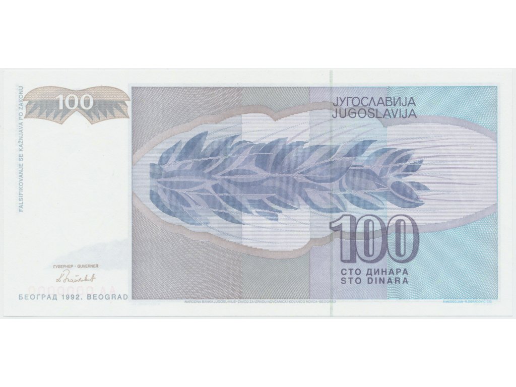 Jugoslávie, 100 Dinara 1992, anulát AA 0000000, P.112