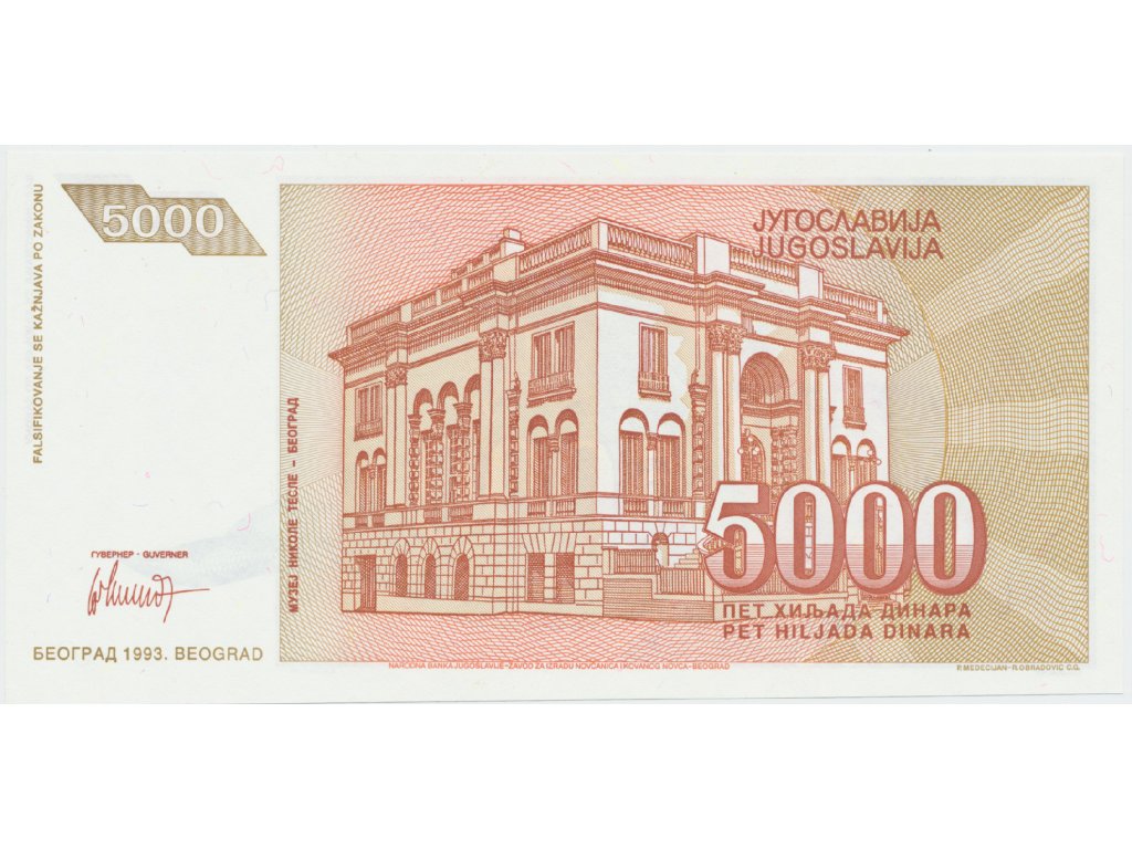 Jugoslávie, 5000 Dinara 1993, nedokončená bez série a čísla, P.128