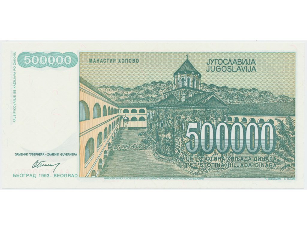 Jugoslávie, 500.000 Dinara 1993, anulát AA 0000000, P.131