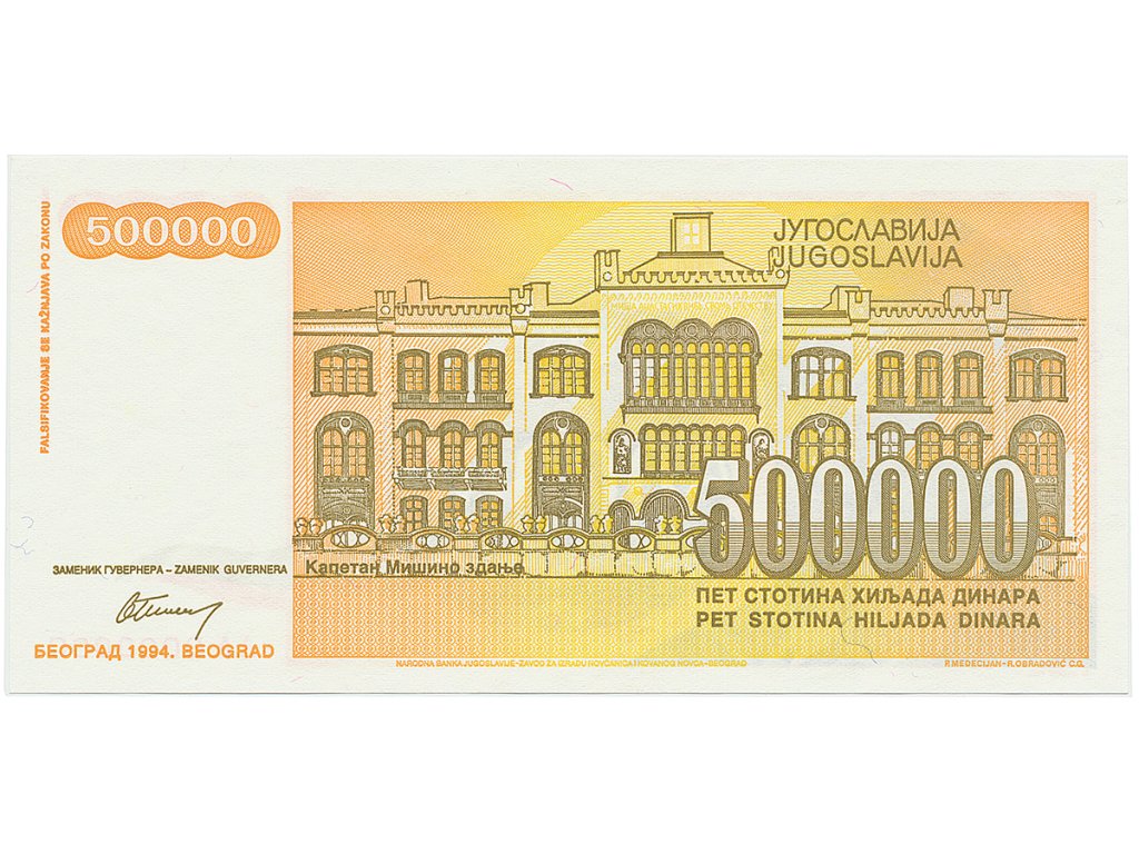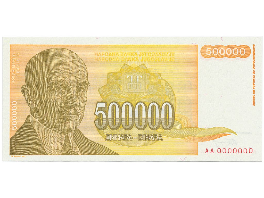 Jugoslávie, 500.000 Dinara 1994, anulát AA 0000000, P.143