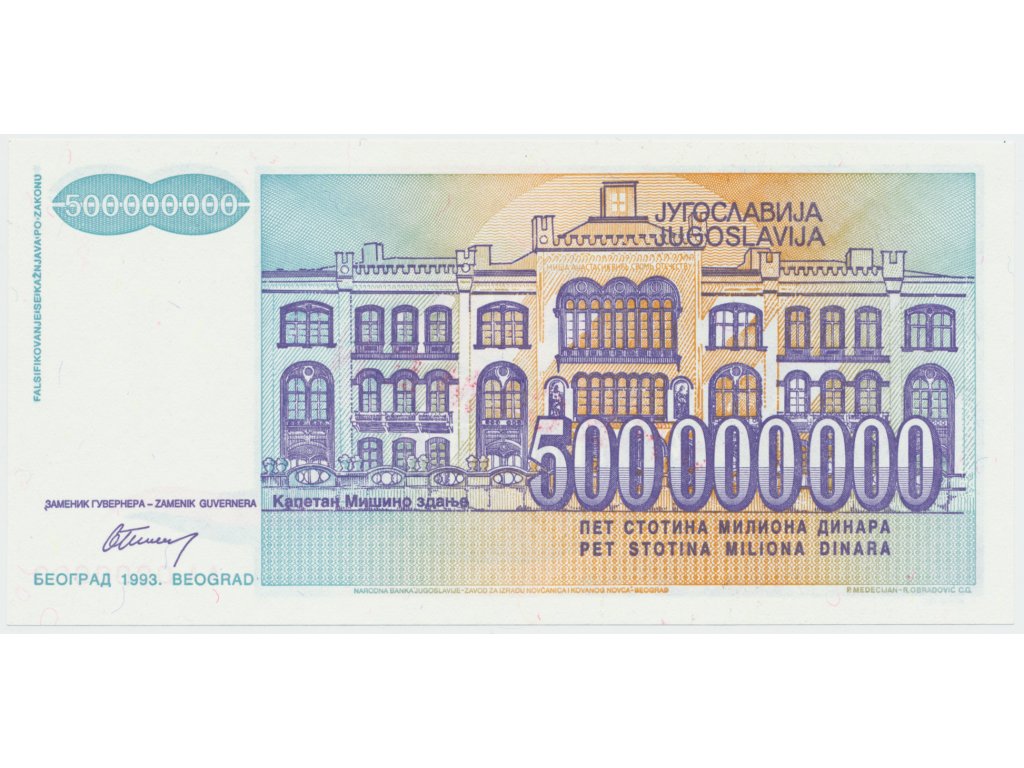Jugoslávie, 500.000.000 Dinara 1993, anulát AA 0000000, razítko SPECIMEN, P.134