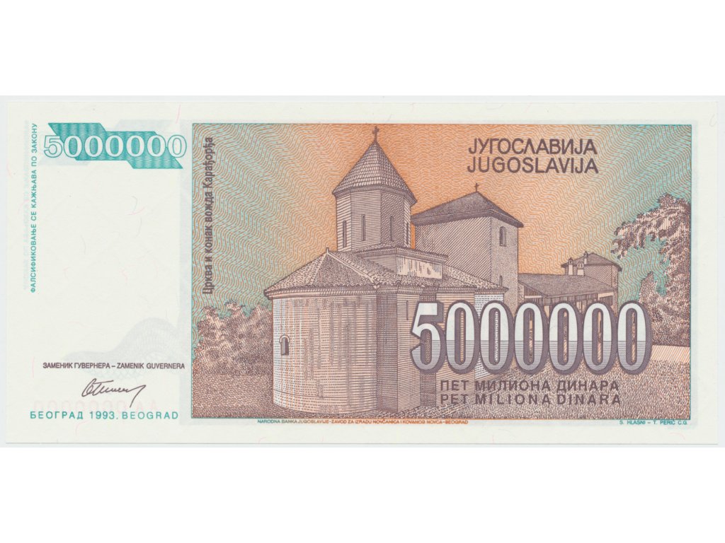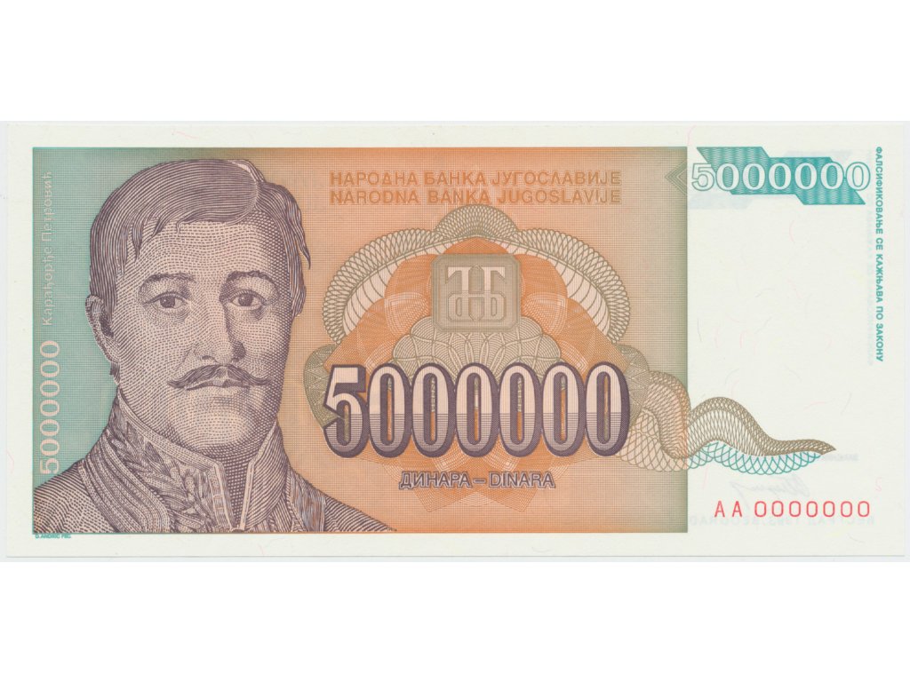 Jugoslávie, 5.000.000 Dinara 1993, anulát AA 0000000, P.132