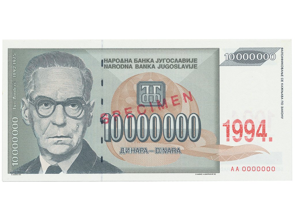 Jugoslávie, 10.000.000 Dinara 1994, anulát AA 0000000, razítko SPECIMEN, P.144