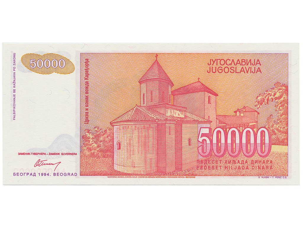 Jugoslávie, 50.000 Dinara 1994, anulát AA 0000000, P.142