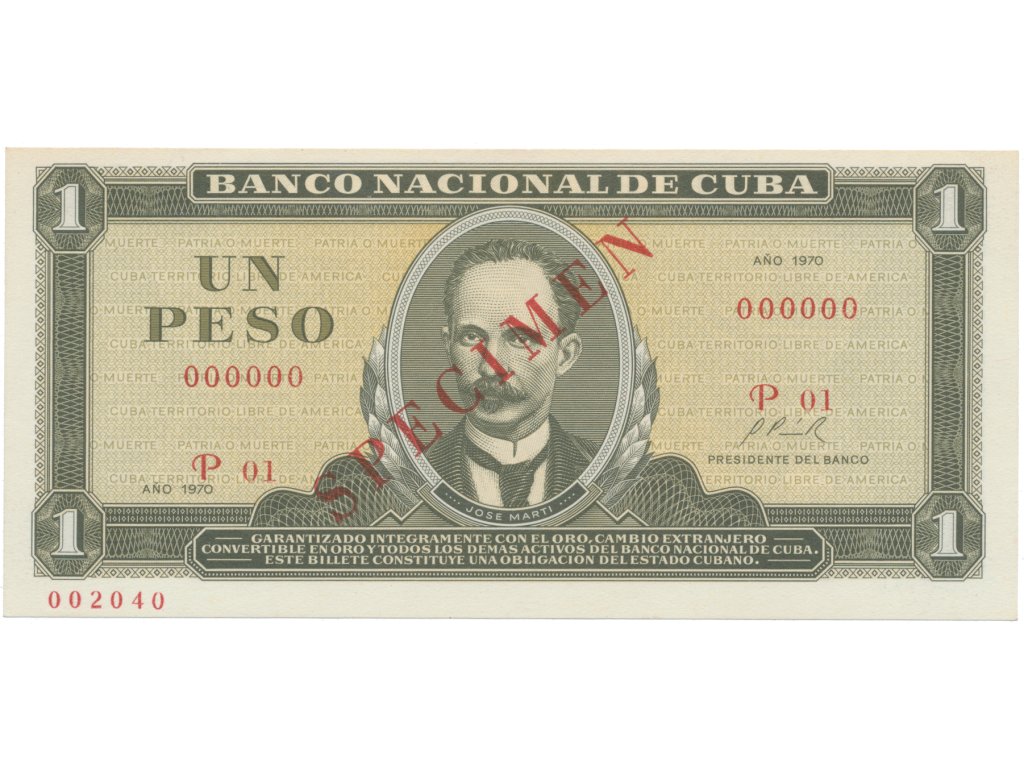 Kuba, 1 Peso 1970, tisk STC Praha, anulát - SPECIMEN, bankovní vzor, P.102as1
